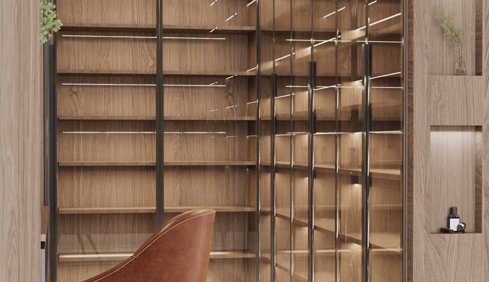 This dressing room features custom-built cabinetry, including spacious wardrobes with sleek sliding doors and open shelving for easy access to clothes, shoes, and accessories.