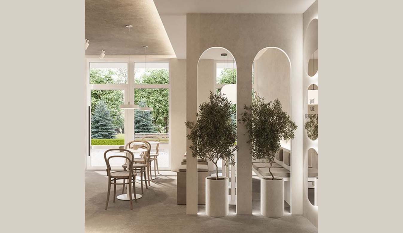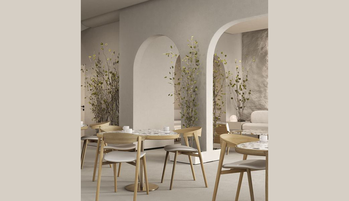 The café design is inspired by the calmness of nature and the warmth of earthy tones, where beige shades combined with natural materials like stone and wood create a comfortable.
