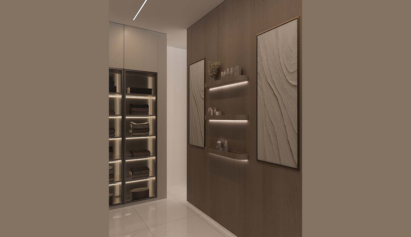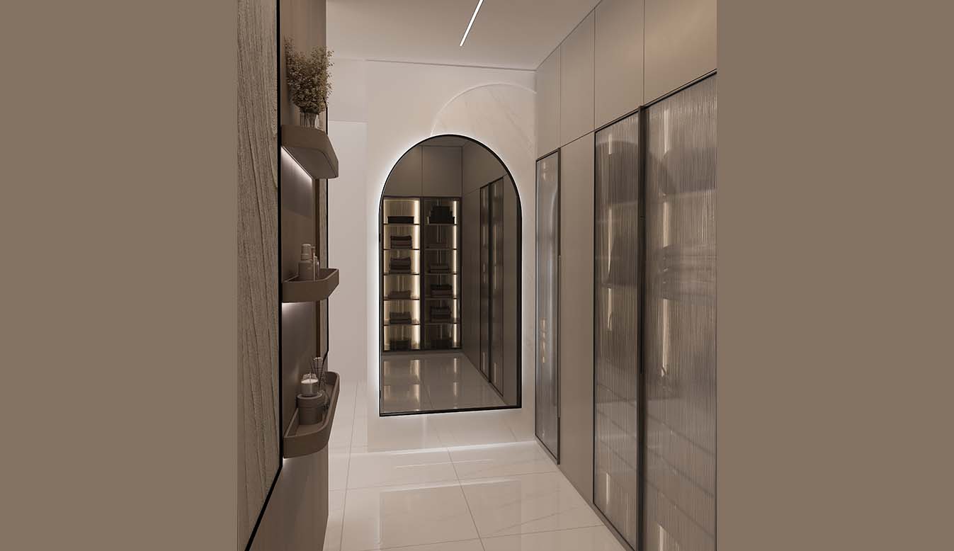 This dressing room features custom-built cabinetry, including spacious wardrobes with sleek sliding doors and open shelving for easy access to clothes, shoes, and accessories.