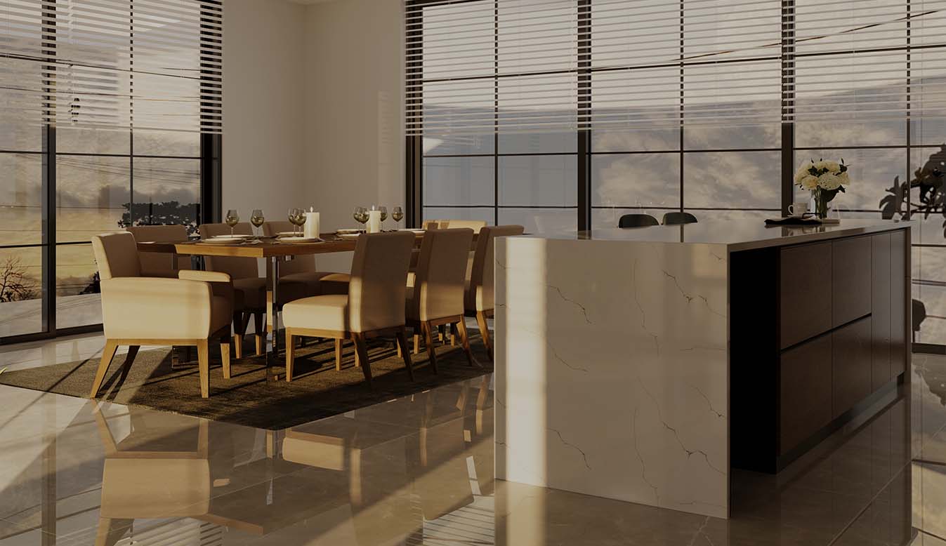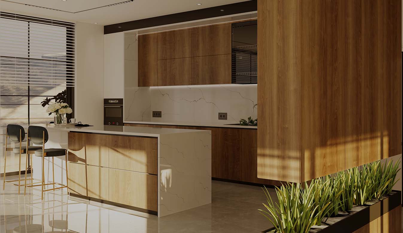 An open kitchen design with a dining table that offers a cozy, flowing atmosphere with modern touches and a warm feel perfect for daily living.